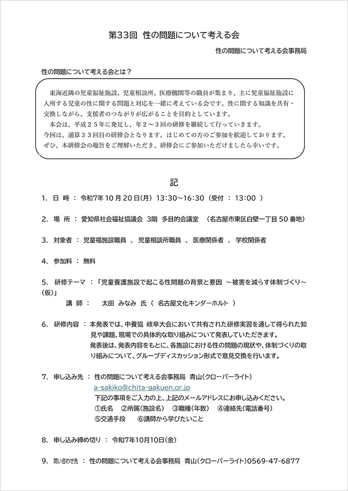 33 | R7.10.20 | 愛知県社会福祉協議会 3階 多目的会議室 | 児童養護施設で起こる性問題の背景と要因 ~被害を減らす体制づくり~(仮)![]() |